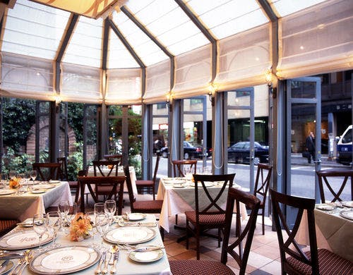 レストランは、通りにひらけてガラス張りのテラスがせりだし、光降りそそぐ空間。 晴れた日にテラスを開け放せば、レストランでのなごやかな歓声が銀座の街角に広がりそうです。