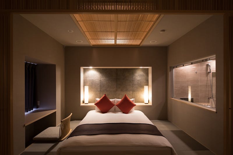 ジャパニーズモダン プレミアムルーム【REN・漣】 は、ベッド上部には千本格子の化粧天井を施し、和と洋をミックスさせたモダンジャパニーズスタイルを提案。