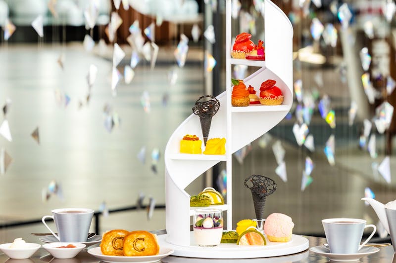 空に浮かぶ白いリボンのような軽やかな螺旋階段を模したフォトジェニックなティースタンドで優雅で華やかなティータイムが過ごしましょう。