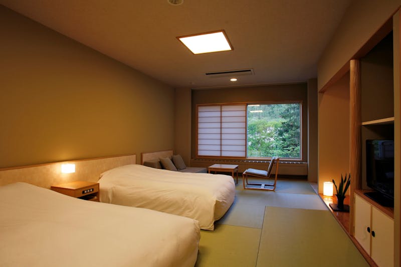 客室は全室が渓谷側に面しており、移りゆく季節の風情、豊な自然の営み、窓に広がる山々、渓流、美しい景観をゆっくり楽しむことができます。