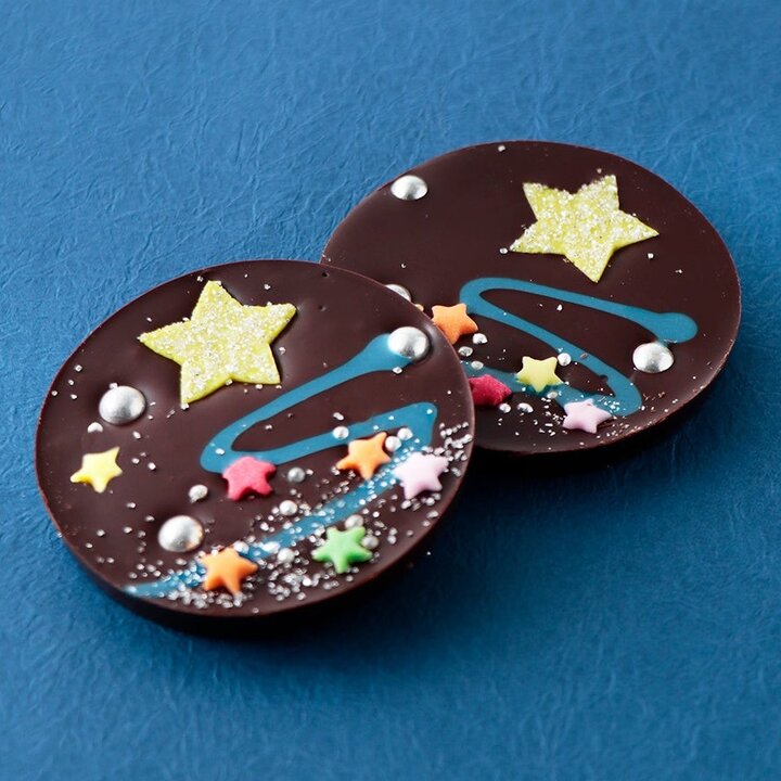 「ベル アメール」の「パレショコラ ミルキーウェイ」は、七夕の夜空をデザイン。ベルアメールオリジナルのビターチョコに、天の川をイメージした青いラインやカラフルな星をデコレーションしています。