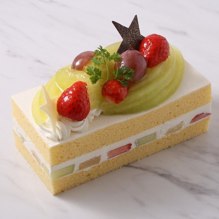 「アンテノール」の「メロンと苺のショートケーキBOX」は、メロン、苺、洋梨をサンドしたショートケーキ。星モチーフのチョコレートをトッピングしています。
