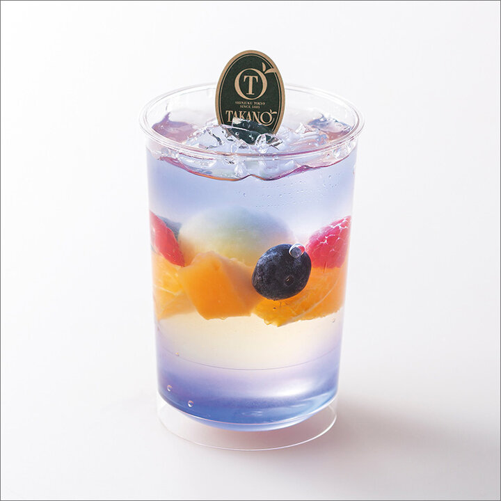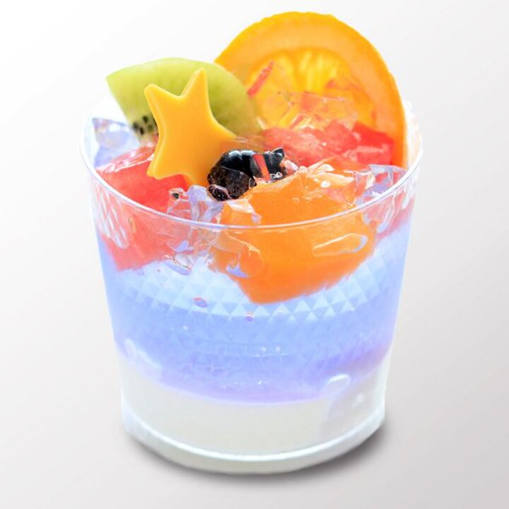 「新宿高野」の「フルーツプラネット」は、7月31日までの販売。バタフライピージュレにシークァーサージュレを重ね、希少糖ジュレにフルーツを浮かべたジュレデザートです。