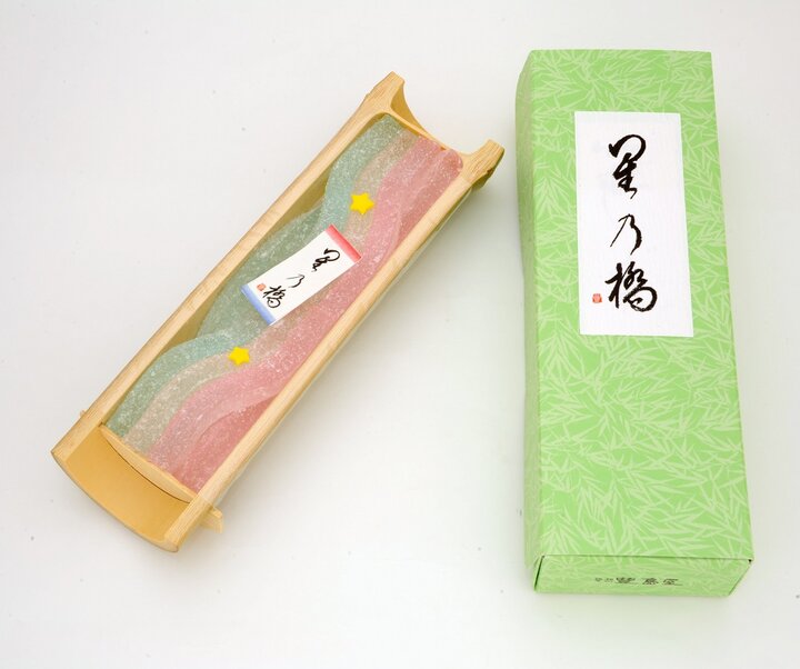 「鎌倉豊島屋」の「星乃橋」は、天の川を錦玉で、織姫彦星を雲平であらわした和菓子です。