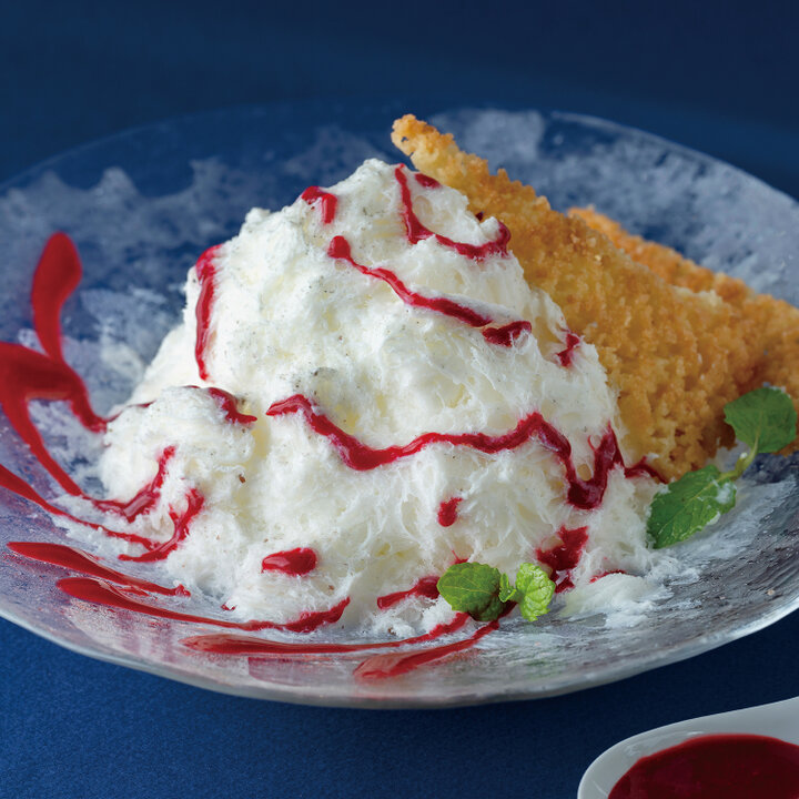 「蔭山樓」の「岩塩とミルクのスノーアイス フランボワーズソース」(1日限定15食)の真っ白なふわふわ氷は、練乳を使用しさっぱりとした甘さのミルク味に仕上げられています。真っ赤なベリーソースをかけ、見た目の鮮やかさをプラス。仕上げには、ヒマラヤのピンク岩塩を挽いています。 岩塩のまろやかな塩味が、ミルク氷の甘さ、ベリーの甘酸っぱさを引き立てます。氷の中には、食感も楽しいナタデココがたくさん入っており、食べ応えも十分なかき氷です。