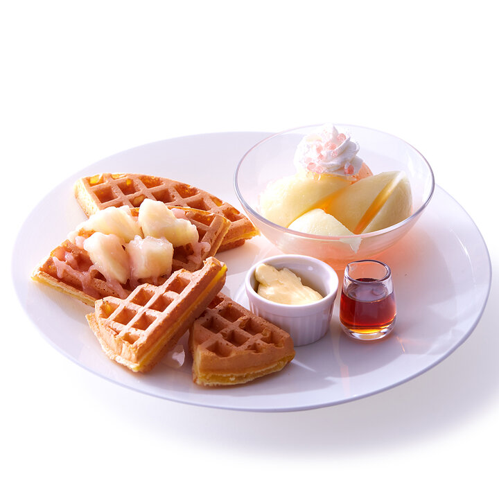 支店5店舗の「桃のワッフル」は、ワッフルにはピーチジャム、グラスにはピーチゼリーとピーチシャーベット&バニラアイスを添えています。 桃とワッフルをシンプルに楽しめる一皿です。