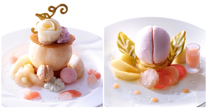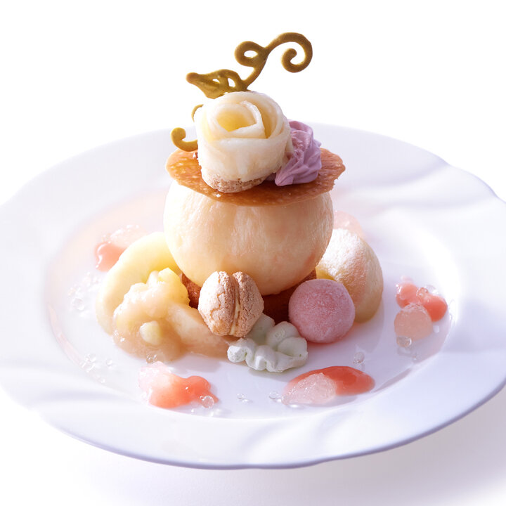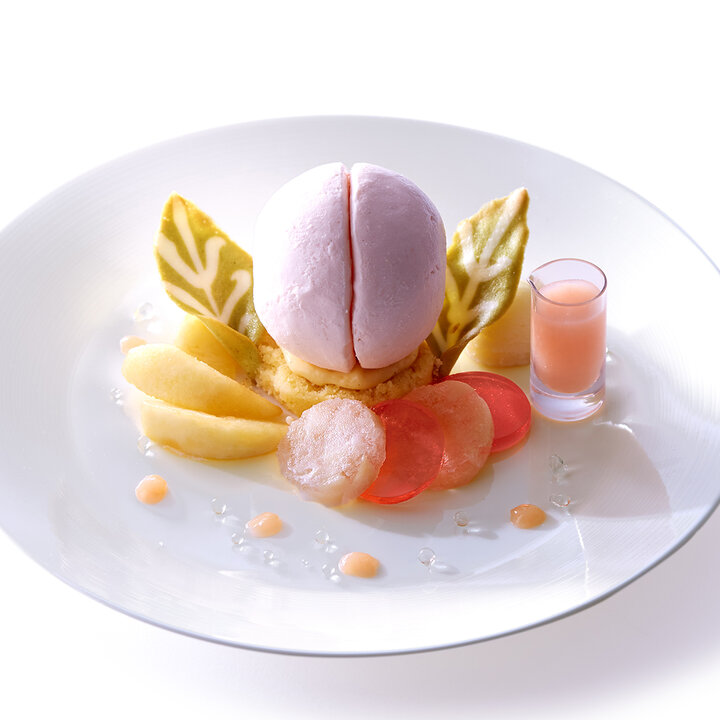 新宿本店/横浜高島屋店の「桃のプレートデザート」は、桃をまるごと楽しめる一皿です。桃の中には紅茶クリーム、桃の皮煮ソース、アーモンドクラッツランを詰めこみ、桃と一緒に頬張れば、桃と紅茶の香りが口いっぱいに広がります。