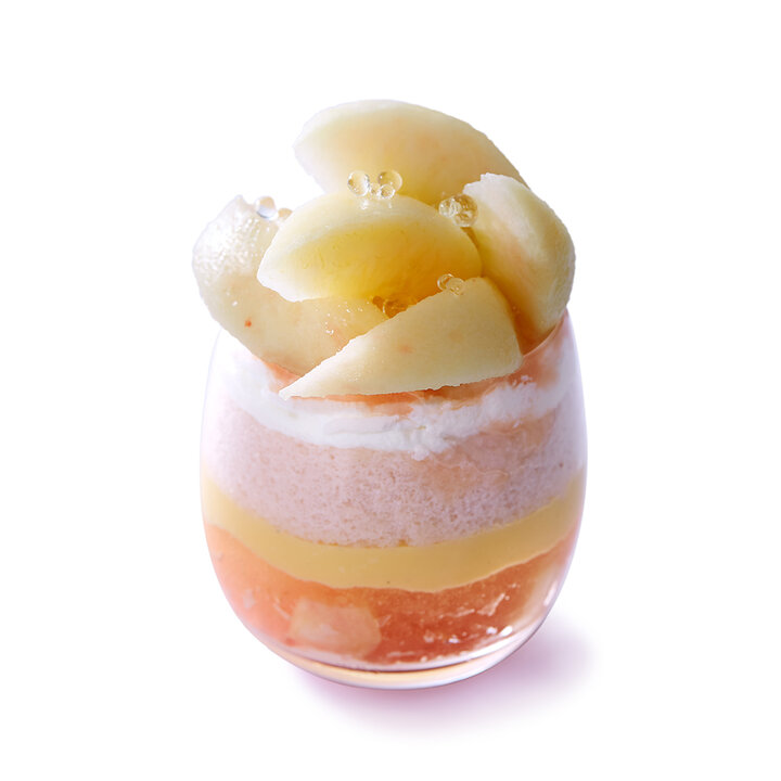 新宿本店/横浜高島屋店の「シーズナルトライフル 桃」は、ピーチシフォンと紅茶クリーム、レモンカスタードを重ね合わせた、ケーキ仕立てのデザートです。 やさしい桃の味わいにプラスして、フランボワーズヨーグルトクリームの酸味がアクセントとなります。