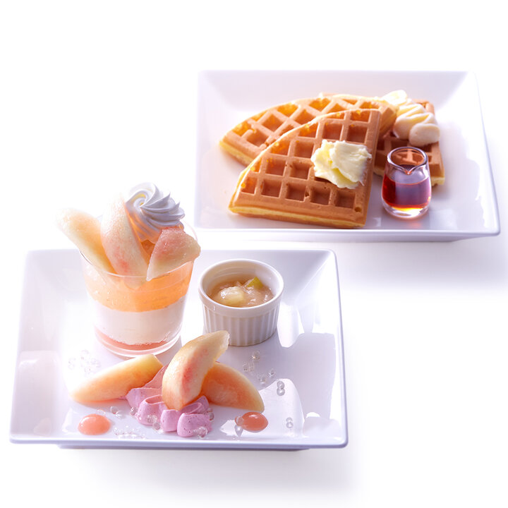 レモンカスタード、バターを添えた新宿本店/横浜高島屋店の「桃のワッフル」は、ココットのピーチりんごジャムもお好みでご一緒に。 紅茶クリームとピーチゼリーを重ねたグラスデザートと、みずみずしい桃の果肉を楽しめます。