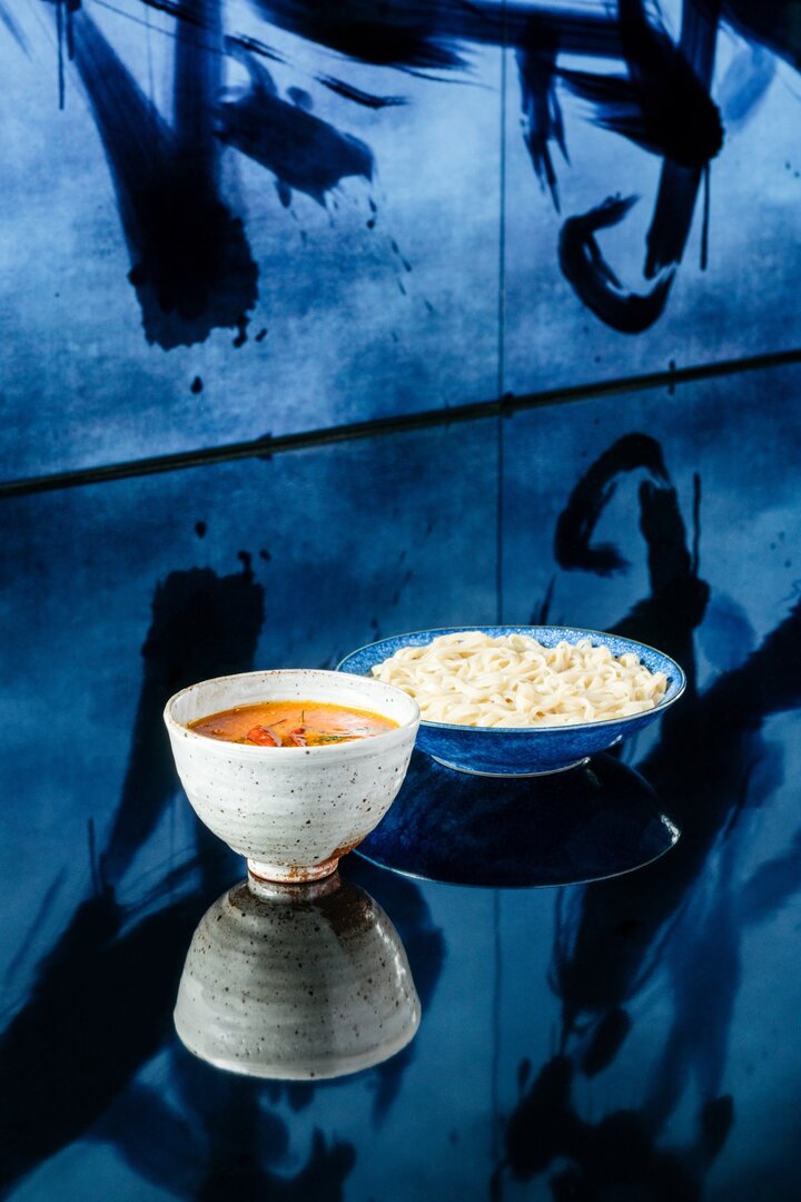夏の季節におすすめの「ヴィーガンラーメン花(冷)」は、チームラボプラネッツの新作、《Floating Flower Garden》を想起させる、梶谷農園のエディブルフラワーを贅沢にあしらった華やかな一品です。 旨味、甘味、酸味をバランスよく配合した冷たいスープで、見た目だけではなく食べ応えと清涼感の共存する一杯に仕立てられています。水で締められたしなやかなコシの自家製の中太麺は、北海道産小麦をベースに有機農業の町、宮崎県綾町の無農薬全粒粉を加えた、風味豊かなツルツルの食感です。 ヴィーガンとは思えない程の深いコクと香りを楽しむことができます。