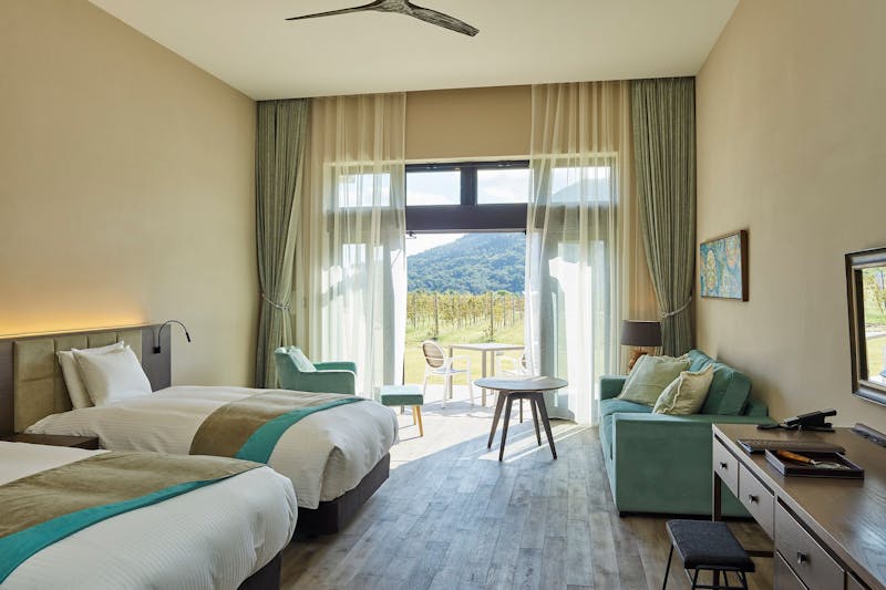 1階の客室は目の前にぶどう畑と角田山が広がり、天井が高くリゾート感あふれる空間が魅力です。2階の客室は見晴らしがよく、一面のぶどう畑と建物群が見渡せます。