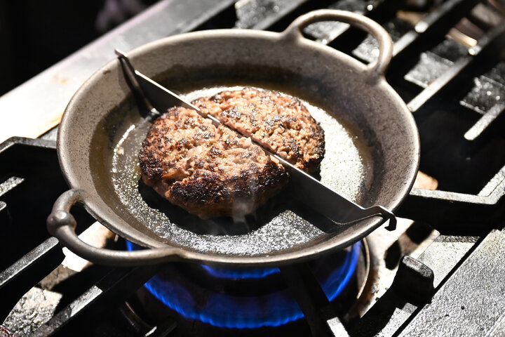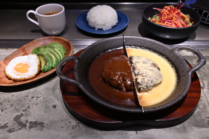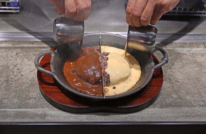 2022年5月、神楽坂にオープンした「ハンバーグとハンバーグ」。鉄板を2つに仕切り、異なる2種のソースがかけられたハンバーグが話題となり、メディアやSNSで取り上げられています。ソースはデミグラスやチーズなど全8種から選べて、36通りの組み合わせが可能。好みの組み合わせを見つけてみてはいかが。