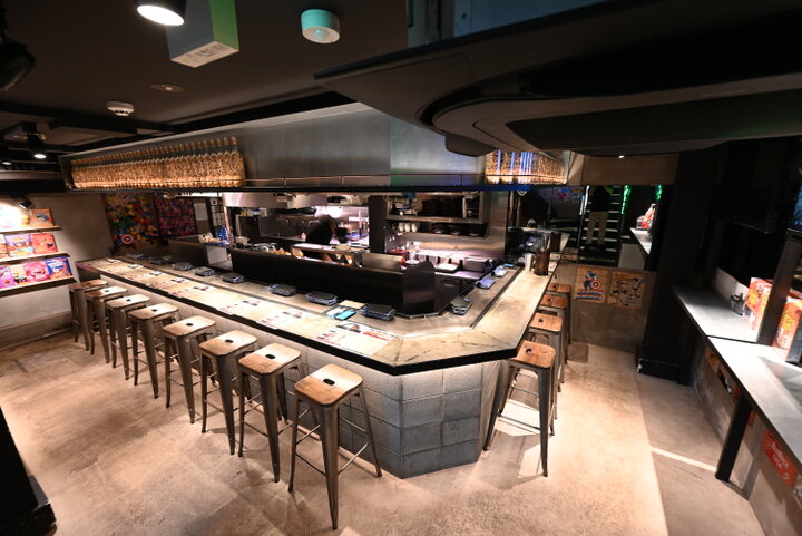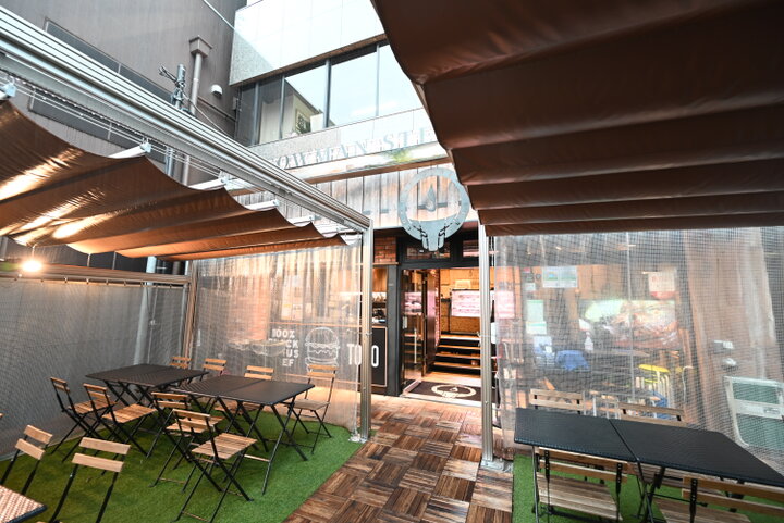店内を見渡すと、アメコミグッズやバスケット選手のユニフォームなどが飾られ、アメリカンテイスト。中央にあるカウンターは間接照明に照らされ、落ち着いた空間を演出しています。カウンター席は12席あるほか、1階外には他店と共用で利用できるテラス席が28席あります。晴れた日はテラス席を利用するのもいいですね。