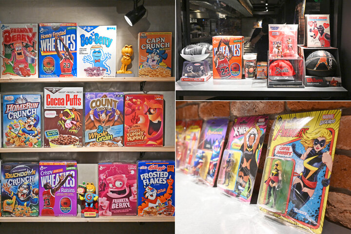 アメリカのお菓子やアメコミヒーローのグッズが並べられた店内