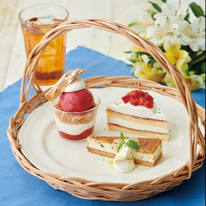 「アフタヌーンティーセット」は、お好みのスイーツ3品(ハーフサイズ)とお好みのお茶をセットで味わえます。 ※画像は「アールグレイとレモンのチーズケーキ」「苺とラズベリーのパフェ」「苺のショートケーキ」とアイスティーの組み合わせです。 またサマーキャンペーンとして、2022年8月15日~8月19日の5日間、アフタヌーンティーセットを注文すると、通常3品のところ4品選ぶことができます。 ■販売期間:通年、14:00~限定メニュー ■販売店舗:アフタヌーンティー・ティールーム ※一部店舗を除く