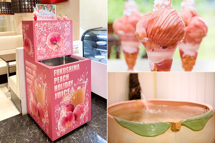(左)福島駅にあるジューススタンド(右上)まるせい果樹園直営「森のガーデン」の桃パフェ(右下)「飯坂温泉松島屋旅舘」の桃の陶器風呂