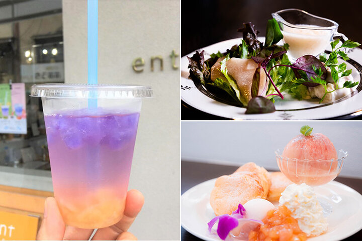 (左)福島市に転入した女性たちが運営するお洒落なお土産屋「ent」 の果肉なモモネード(右上)「納屋カフェ椿」の桃のドレッシングと桃のサラダ(右下)「CANDY-DO」の桃のパンケーキ