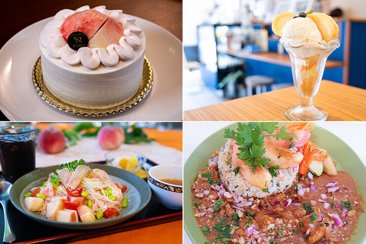(左上)「パティスリーエクロール」の桃のケーキ(右上)「ミナモカフェ」系列のジェラート専門店のアイスを使った本格桃パフェ(左下)「松屋レストラン 憩いカフェ」 冷製桃サラダそうめん(右下)「大笹生カリィ」の奇跡の桃カリィ