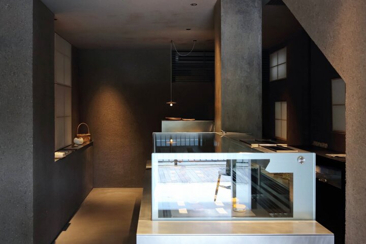 地下鉄烏丸線・丸太町駅の2番出口から徒歩で2分ほど、烏丸通を北上します。キュートな牛みくじが人気の菅原院天満宮の少し南、3階建てレンガ風ビルの1階が「菓歩菓歩 京都御所西店」です。やさしい響きの店名は、「めまぐるしく流れていく時のなかでも、変わらずゆっくりと丁寧に、一歩一歩進んでいきたい」との想いから。グレーが基調の落ち着いた内装は、土や和紙、アルミの素地、墨染めした木材など、菓歩菓歩のお菓子と調和するよう選び抜いた自然素材で空間を包むことをイメージしたのだそう。