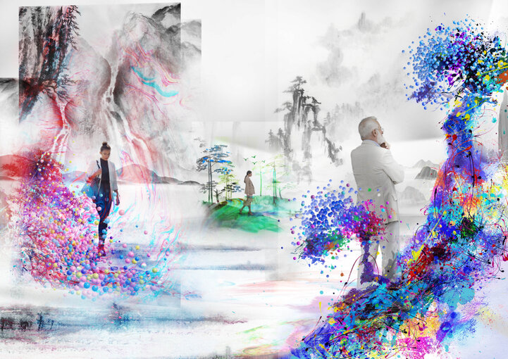 茶室の床の間に飾られる重要な芸術品として発展し、日本人の精神、魂を形成する芸術作品である掛け軸。床の間に掛けられた掛軸の絵画の中の世界に入っていくと、奥には水墨画の世界が広がります。 水墨画の絵画の作品の中に入り込むイマーシブアート作品です。