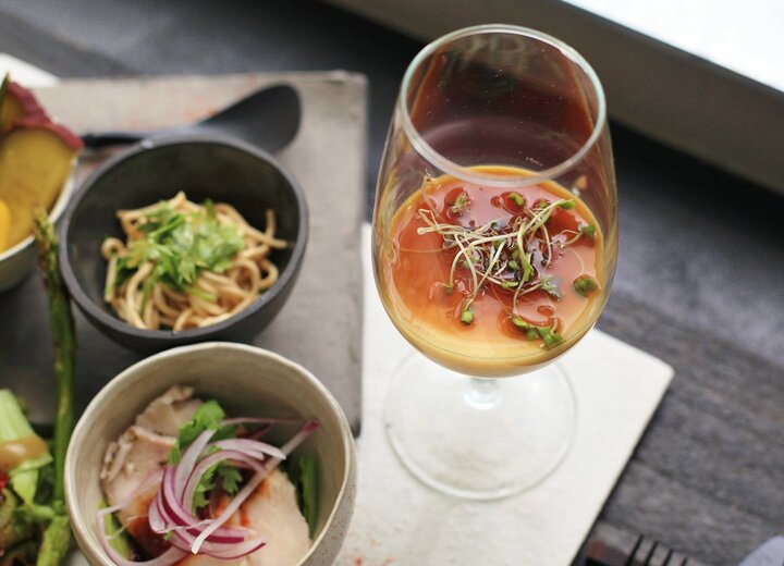 こちらで楽しめる料理はイタリアンや中華、和食など、さまざまな料理のアイデアを融合させた品々。ランチはそんなさまざまな料理を一つのプレートに仕立てています。 本日の前菜は紹興酒漬けにした枝豆やエルダーフラワーの香りがするピクルス、干し豆腐のアンチョビマリネ。風味や香りのインパクトに驚かされ、お酒と一緒に楽しみたくなります。