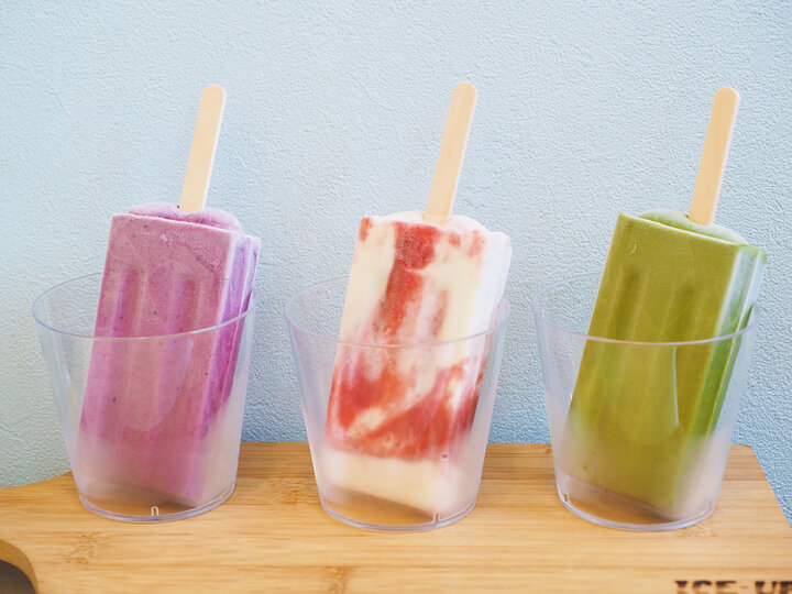 ショーケースには、およそ10種類のアイスキャンディーが並びます。定番のほかに、期間限定フレーバーや店主の気まぐれで登場するものもあり、どれにしようか迷ってしまいそう。 アイスキャンディーは原料にもこだわり、乳化剤や安定剤を使用しない無添加が基本。グリーンやパープルなど鮮やかな色は、着色料ではない素材そのものの色味です。