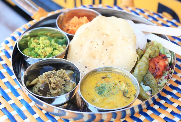 こちらのおすすめは、地元の漁師さんから仕入れた魚介類や地元野菜で作る、ミールス。スパイスやハーブが香る野菜の総菜や薄焼きパン、パパドなどをカレーと合わせて食べる南インドスタイルのカレーです。本日のカレーは日間賀島の鱧を使ったカルダモンやシナモンなどのスパイスが香るカレー。鱧のうまみが広がる贅沢なカレーは日間賀島ならではのものです。