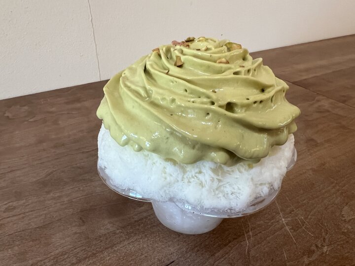 また、兵庫「にしのみや果汁店」からは「ピスタチオエスプーマのかき氷」も登場します。 練乳がたっぷりかかった氷に、「BABBI」のピスタチオクリームを使ったふわふわのエスプーマをあふれんばかりにのせています。 中にもピスタチオソースが入った、ピスタチオ好きにはたまらないかき氷です。