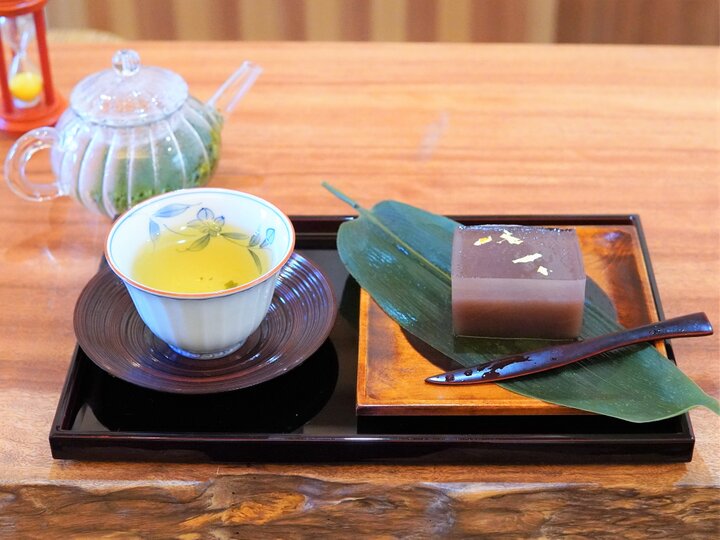 お菓子と一緒にいただく日本茶は煎茶とほうじ茶から選びます。静岡県産の高級煎茶はかわいいガラスの急須に入っていて、お湯を注いで待つこと1分。一煎目を味わったら、二煎、三煎とお湯を足しておつづきが楽しめます。 取材時には金粉を贅沢にちりばめた錦玉羹とラム酒を効かせた水羊羹の2層が涼し気な和菓子「南風」とセットにしていただきました。大きくカットされていて食べ応えも十分です。