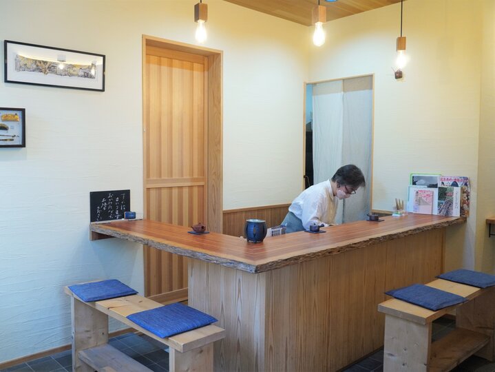 一枚板のカウンターのある店内はしっとりとした落ち着きがあり、縁台や障子など木の温もりも伝わる和風の空間です。茶香炉からはお茶の香りがほんのりと漂い、大きな陶器の菓子鉢を白メダカが泳ぐ水鉢に仕立てた窓辺の風情は日本の情緒も感じられる古都らしいお店です。