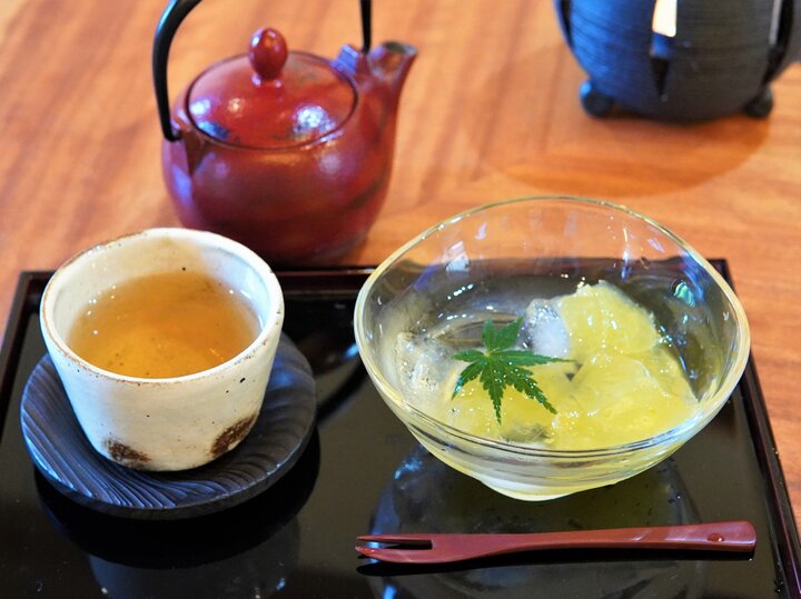 ほうじ茶は鎌倉で古くから親しまれている枝村園で焙煎した茶葉で、豊かな香りと共に味わいます。急須も日本各地の産地でつくられる作家さんの作品を使っていて、どっしりとした赤い急須は南部鉄器に漆塗りをほどこした根来塗りと伺いました。お菓子の器や湯呑もステキで、それぞれの由来をカウンター越しに気さくな店主から聞くのも楽しいひとときです。 オーダーしたわらび餅も自家製柚子ペーストを練り込んで柚子シロップに浮かべた夏らしい風合い。わらび餅も季節ごとに姿を変え、鎌倉の四季を感じながら楽しめますよ。