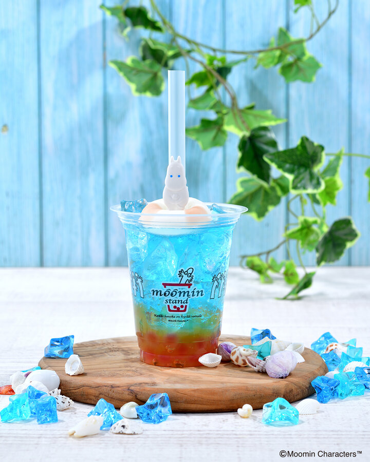 ムーミンスタンド全7店舗(コピス吉祥寺店、ランドマークプラザ店、サンシャインシティ店、土岐プレミアム・アウトレット店、天王寺ミオ店、イオンモール広島府中店、キャナルシティ博多店)では、「ムーミン うきわでぷかぷかソーダ」が登場します。 はちみつレモンとブルーキュラソーシロップのソーダに、りんごの果肉ソースと、ムーミンスタンドオリジナルのベリー味のニョロニョロのたねが入った、夏らしい爽やかなドリンクです。 マシュマロでできた縞模様のうきわで、ムーミンが気持ちよさそうにぷかぷかと浮かんでいるような一品です。 ムーミンスタンドオリジナルのムーミンストローで提供されます。