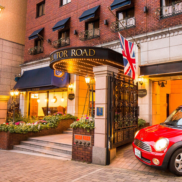 古きよき神戸らしさを残すトアロードの中ほどに立つ「神戸トアロードホテル山楽」までは、JR三ノ宮駅・私鉄各線の三宮駅、JR元町駅から徒歩7~8分。風にはためくユニオンジャックと、その柄をルーフにあしらったまっ赤なミニクーパーが目印です。暖炉とアンティーク家具を配したロビーに入るとマスコットのテディベアが出迎えてくれ、イギリスのホテルにチェックインした気分になります。