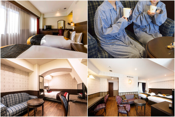 カントリーテイストのインテリアでまとめられた客室は全77室。スタンダードフロアとプレミアフロアの2タイプがあります。1~3名までのさまざまな客室が用意されているのがスタンダードフロア。ゆったりサイズのベッドが置かれた「ダブル」、広々とした室内にキングサイズのベッドが置かれた「キング」、独立したパウダールームがあり女子旅に人気の「ツイン」、グループ利用に最適な「トリプル」など、人数に合わせて選べます。 バスルームには、女性に人気のブランドアメニティをご用意。ギンガムチェックのワンピーススタイルのルームウエアも、おしゃれなうえくつろげると人気です。