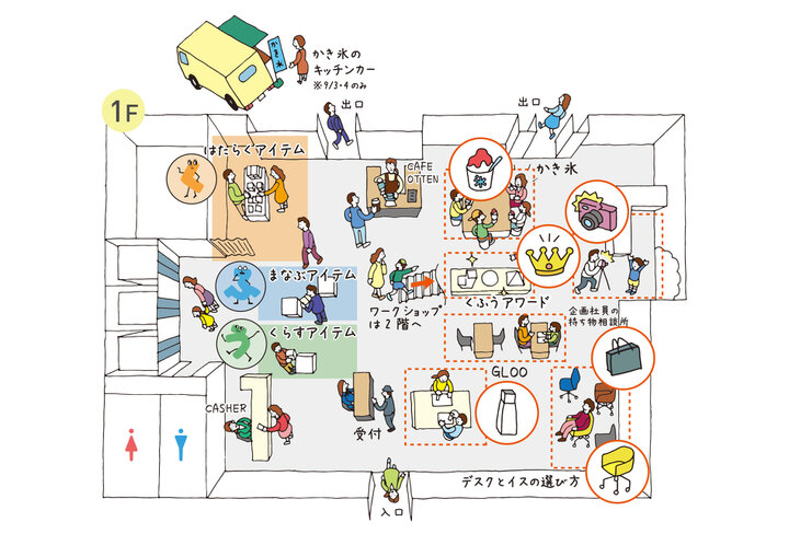 メイン会場の1階では、かき氷の販売や、くふうの詰まったコクヨ文具の販売、GLOOのワークショップや、ノウハウのある社員からの持ち物指南、デスクとイスの選び方コーナーなどを展開します。また、2階では、多彩なワークショップが開催されますよ。