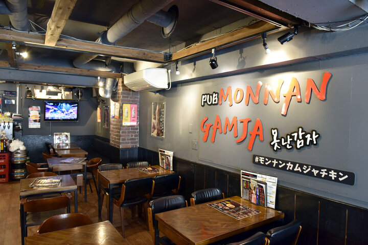 JR新大久保駅から徒歩3分、大久保通り沿いにある「モンナンカムジャ」。ビルの2階にありますが、赤い文字で店名が書かれた黒の看板が目印になっています。黒を基調とした店内にはK-POPアイドルの動画が流れ、海外気分が高まります。