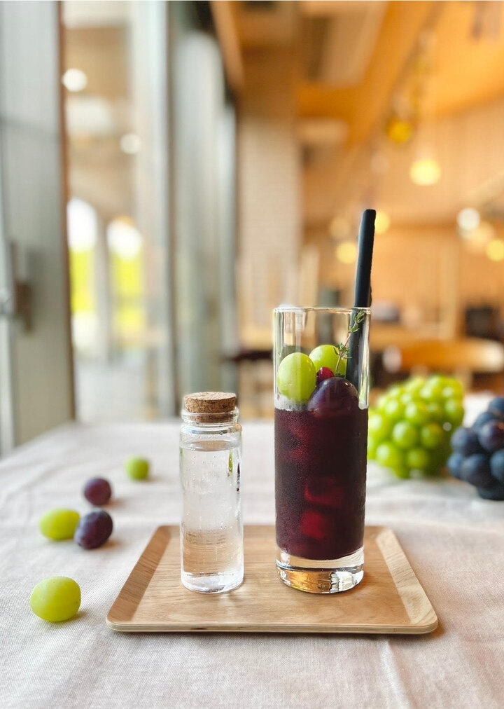 「葡萄サイダー」は、ぶどうのジャムやゼリー、ジュースが入ったぶどう尽くしのドリンクです。 ぶどうを豪華に丸ごとトッピング、炭酸をお好みのタイミングでお好きな量を注いで召し上がれ。
