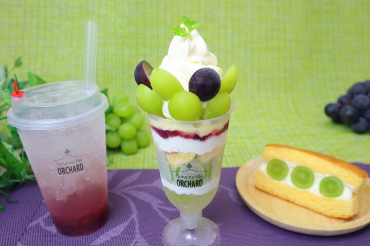 「空の駅 オーチャード」では、パフェなど3点が登場します。 ●シャインマスカットとピオーネのオーチャードパフェ シャインマスカットとピオーネをふんだんに使用したパフェです。 ジューシーでみずみずしいぶどうをぜひ楽しんで。 ●シャインマスカットのまるごとフルーツサンド 爽やかなシャインマスカットがごろっと入った、昨年も好評だった一品です。 ●グレープソーダ 赤ぶどうジャムを使ったソーダ。 赤ぶどうのつぶつぶ食感が楽しい、まだまだ暑い季節にぴったりなドリンクです。