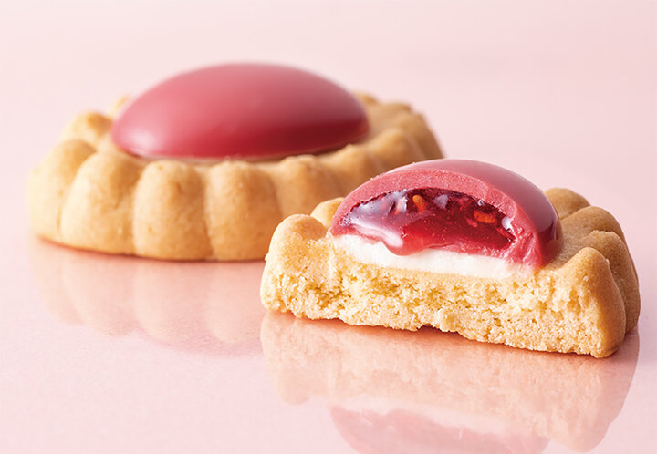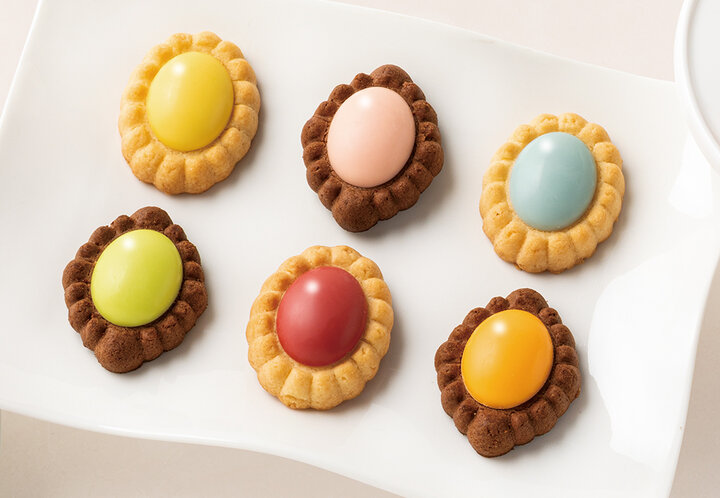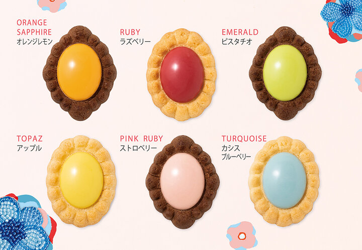 味は全部で6種類。どれも宝石をイメージした美味しさとカラーで作られています。 華やかなレッドルビー「ラズベリー」を筆頭に、可憐なピンクルビー「ストロベリー」、高貴なグリーンエメラルド「ピスタチオ」、爽やかなイエロートパーズ「アップル」、神秘的なブルーターコイズ「カシスブルーベリー」、元気をくれるオレンジサファイヤ「オレンジレモン」。 ひと目でひと口で心がとろけてしまう、“クッキーに縁どられた宝石ボンボンショコラ達”を召しあがれ。