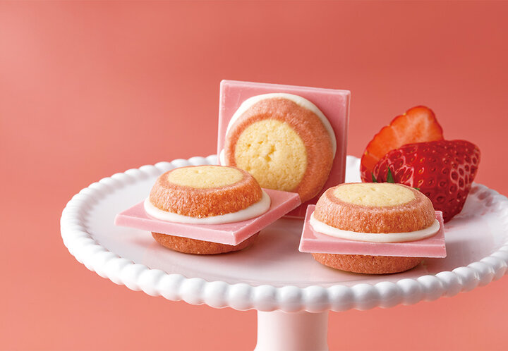 「苺ショコラサンド ルビーカラーズ」もポップアップストアに登場。一番のポイントは、真っ赤な苺を丁寧に練り込んだグランドサイズのベリーショコラです。 さらにクリームもあふれるほどのせて、ルビーリングを描いたサクサクのクッキーで贅沢に「はみだしサンド」しています。 華やかにとろける苺の香りをたっぷり楽しめる、ルビー色がキュートな苺ショコラサンドです。