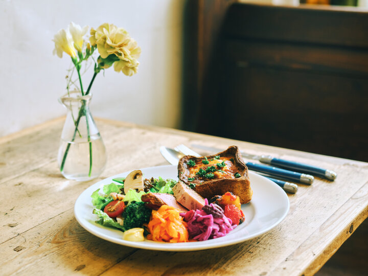 ランチは、パイ型に具材を入れて焼き上げたフレンチ総菜のキッシュをメインに、ローストポークやたっぷりの野菜をのせたプレート。パンやスープも付きます。 また、キッシュ以外にもキューバサンドなど、その時々でメイン料理も登場するので、訪れた日にチェックをして好みを選びましょう。 カフェタイムには、飲み物と季節のフルーツタルトやヌガーグラッセなどの「デザートセット」1210円が味わえますよ。
