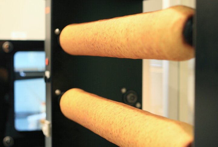 店内のパティスリーコーナーには、バームクーヘン専用のオーブンがあり、お店で生地から作り焼き上げるバームクーヘンを楽しむこともできます。 老舗洋菓子店から受け継いだレシピを元に作り上げたバームクーヘンは、ドイツ・リューベック社のマジパンローマッセを配合するなど、本格的な味わい。発酵バターやラム酒で風味豊かに仕上げていて、焼いてから生地を落ち着かせるため一晩おいてからカットして販売しています。