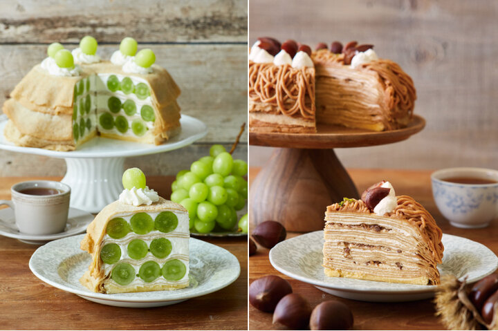 今回は秋季限定で、みずみずしさはじける“シャインマスカット”と、ほっくりした甘さの“マロン”を贅沢に楽しめる「シャインマスカットのミルクレープ」「マロンのミルクレープ」が登場します。