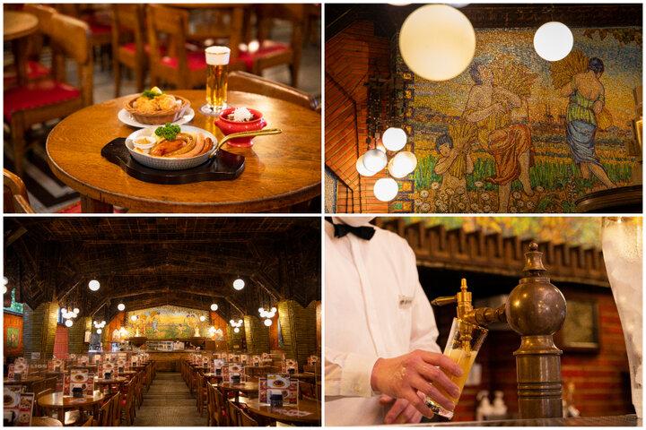 内装のコンセプトは「豊穣と収穫」。大麦や葡萄をモチーフにした装飾が施され、ゆったりお酒を楽しめるような温かい雰囲気を創り出しています。圧巻なのは店内正面を飾るガラスモザイクの大壁画。ビール麦の収穫に働く女性たちを描いたもので、縦2.75m 横5.75mの大きさがあります。80年以上もの間、 銀座の歴史を伝える歴史的建造物として親しまれてきたことから、2022年2月には国の登録有形文化財(建造物)にも認定されました。
