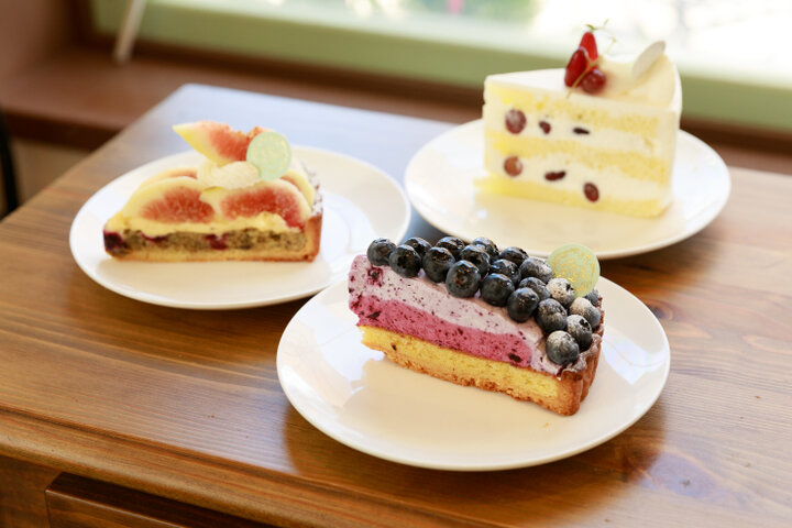 左からイチジクと紅茶のタルト500円、山ルビーショートケーキ480円、ブルーベリータルト530円