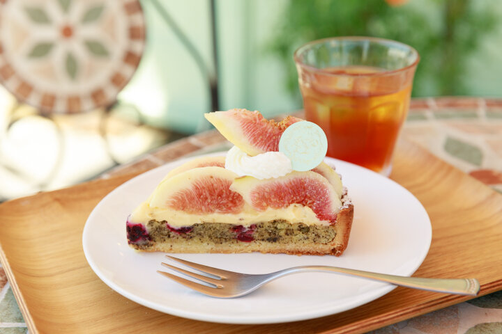 ケーキはテラス席で味わうこともできます。「イチジクと紅茶のタルト」は長瀞産の紅茶と新鮮なイチヂクを使って作られています。完熟のイチヂクがみずみずしく、タルトは甘すぎず、生地に盛り込まれた茶葉が華やかに香ります。こちらは9月下旬頃までの販売です。