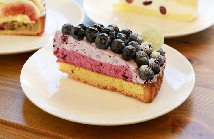 こちらはブルーべリータルト。秩父産の新鮮なブルーベリーをたっぷりと使用しています。 香ばしいアーモンド風味のタルト台にブルーベリームースを重ね、その上に摘み立てのみずみずしいブルーベリーがたくさんのっています。プチっとはじけるブルーベリーの果汁がジューシーで、甘さと酸味のバランスが絶妙です。ブルーベリーが旬を迎える毎年6~8月下旬に販売しています。