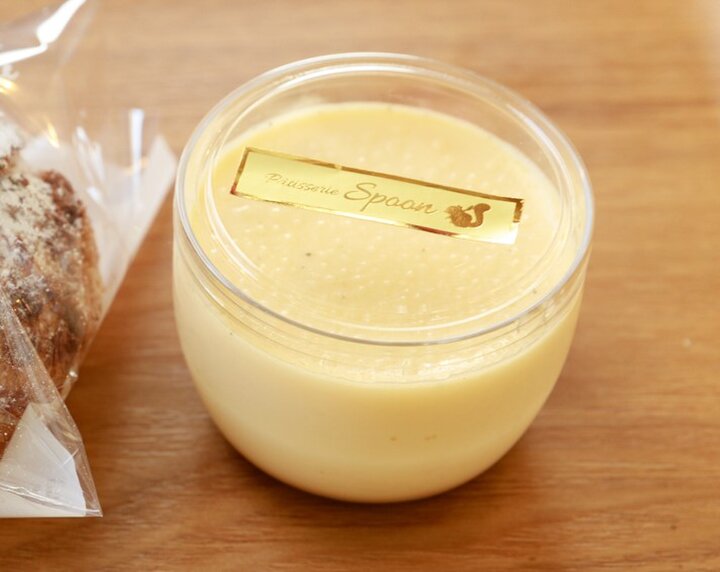 こちらはSpoonプリン。シュークリーム同様通年店頭に並ぶ人気メニューです。たっぷりの卵を使用した少し硬めのプリンで、焦がしカラメルのほろ苦さがアクセント。昔ながらのプリンといった味わいでファンも多いそうです。
