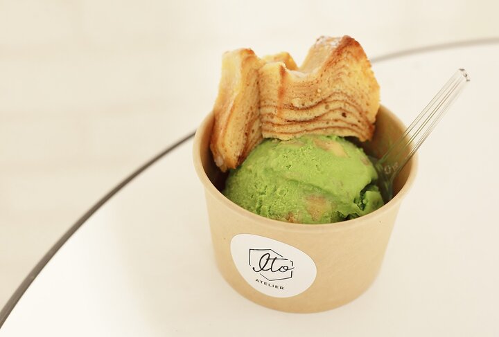 星野抹茶のアイスに金の糸を混ぜ合わせたアイス「HAKATAMIX」(501円)※ATRIEITOは池袋会場のみの出店