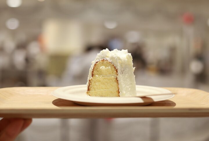 会場にはバウムクーヘン専用のAI焼成機「THEO」がバウムクーヘンを焼いていて、焼き立てのバウムクーヘンを味わうこともできます。焼き立ては卵の香りがふんわりと漂い、ふかふか、しっとり。柔らかいのですぐにカットするのは難しいですが、特別な配合と技術により、焼き立てを楽しむことを可能にしました。
